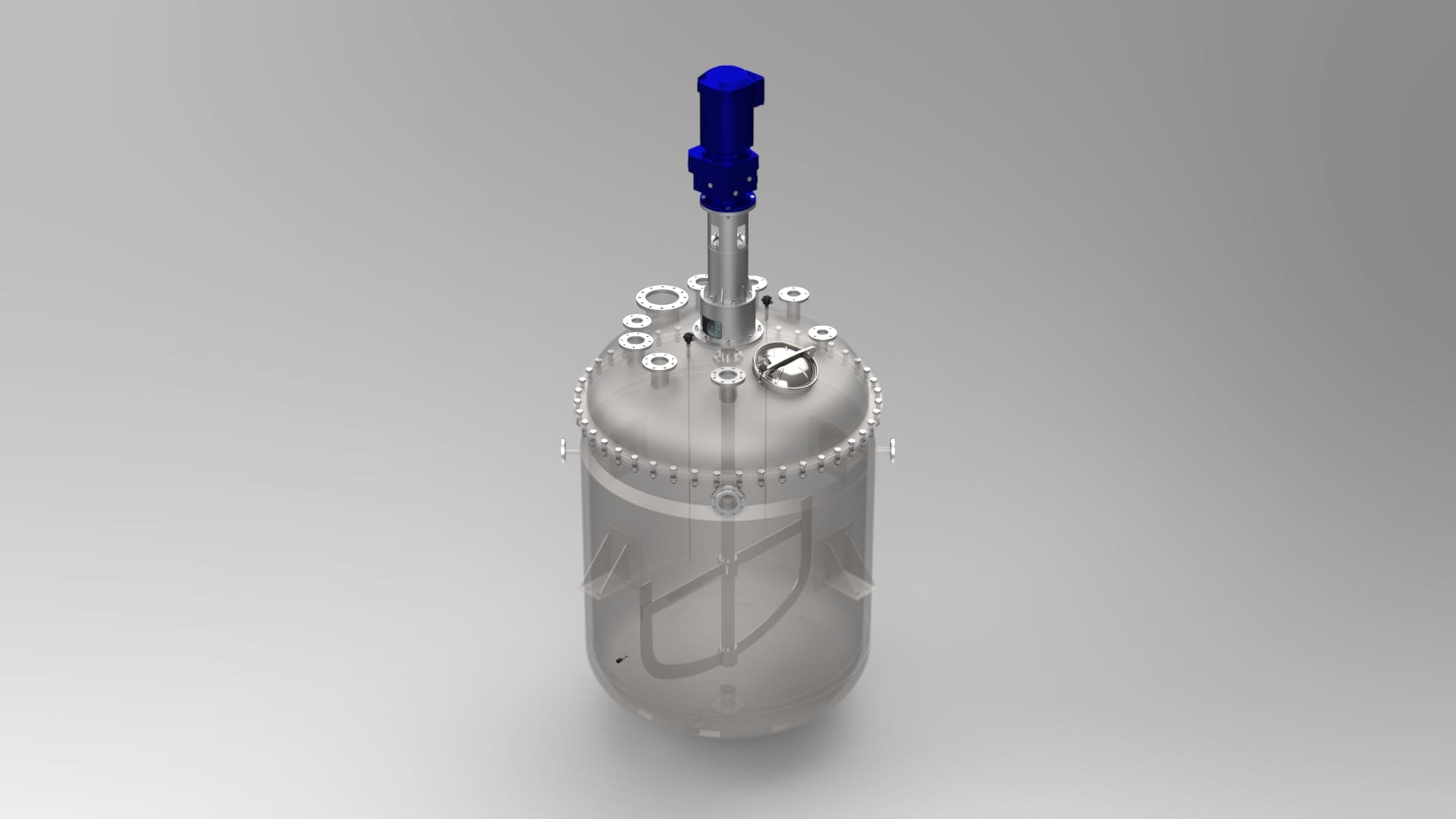Вакуумный реактор предназначен для технологической обработки пастообразных продуктов парфюмерно-косметической и лакокрасочной промышленностей. Вакуумный реактор - герметичная теплоизолированная емкость, состоит из ванны внутренней, к которой герметично приварен змеевик циркуляции пара или хладагента, теплоизоляции, перемешивающего устройства с приводом, парового барбатера для обработки продукции острым паром, наружной облицовки, откидной крышки. В конструкции реактора предусмотрена система трубопроводов и запорной арматуры, позволяющая изменять в широком диапазоне технологические параметры процесса обработки продукции (нагрев, охлаждение, обработка острым паром, деаэрация с помощью вакуума, вакуумное выпаривание при производстве густых и пастообразных продуктов плодово-ягодного ассортимента). Для более равномерного нагрева и охлаждения продукта в реакторе имеется мешалка. Вращение мешалки осуществляется от привода, который располагается на откидной крышке миксера. На крышке также установлены предохранительный клапан и кран связи с атмосферой. Вакуумный реактор с мешалкой работает по следующему технологическому циклу: обьёмное дозирование растворимых компонентов в приемную воронку и загрузка их в основную варочную емкость с помощью вакуума -> весовая загрузка труднорастворимых компонентов -> перемешивание с помощью высокоскоростной пропеллерной мешалки и загрузка их в основную емкость с помощью вакуума -> в зависимости от технологического процесса обработки: нагрев с помощью парового барбатера (обработка продукта острым паром), или нагрев с помощью циркуляции пара по змеевику -> процесс гомогенезации или рециркуляции для выравнивания температуры продукта по всему обьему и более тщательного перемешивания -> охлаждение с перемешиванием с помощью подачи хладагента в змеевик (если это требуется технологическим процессом) -> обработка продукта вакуумом для удаления кислорода в целях увеличения срока годности готового продукта -> слив продукта. Контроль и управление технологическими параметрами процесса (температура, давление и время процесса) осуществляется в автоматическом или ручном режиме.