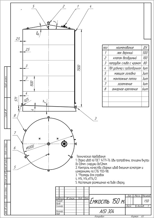 Диаметр 5000, высота 7500, чистота внутренней поверхности Ra0.8мкм.